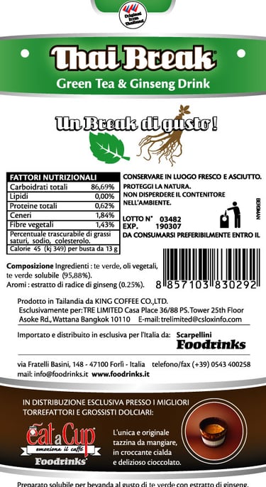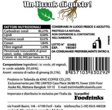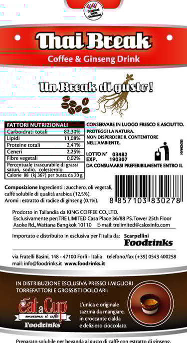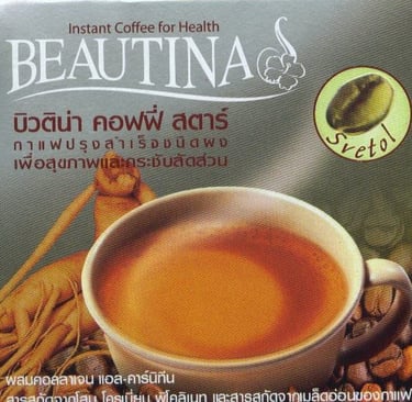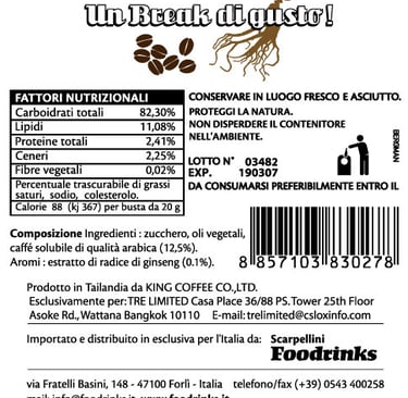 Sugar, Arabica instant coffee powder 10. %, non-dairy creamer (from oils of Palm), Org. Ginseng Extract 1 %